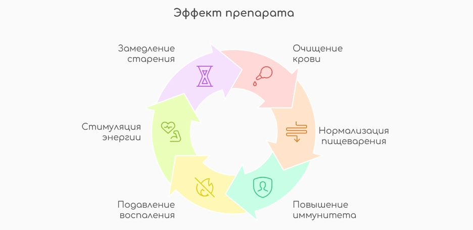 Терапия улучшает работу нервной системы и психоэмоциональное состояние, эндокринный баланс, когнитивные функции. Разнонаправленное действие происходит не напрямую, а через две важные системы: гепатобилиарную, иммунную.